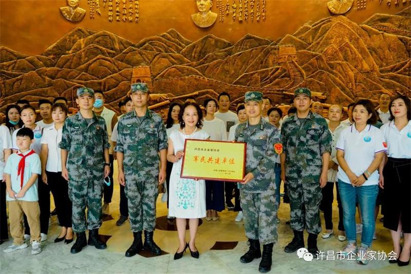 楊根思連部隊政委翟繼群向許昌市企業(yè)家協(xié)會授“軍民共建單位”匾