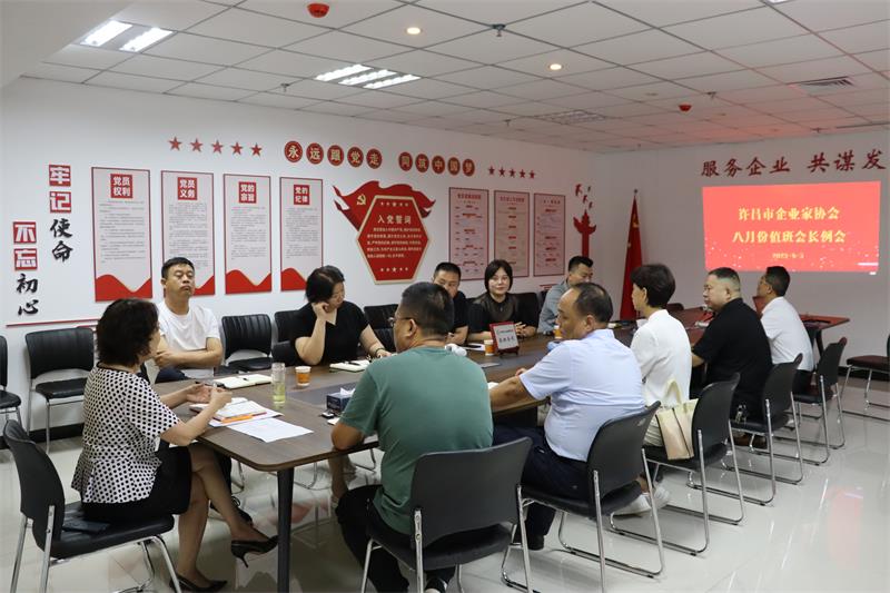 8月5日下午,許昌市企業(yè)家協(xié)會8月份輪值會長工作交接會在協(xié)會會議室召開,會議由八月份值班會長、河南安得廣廈物業(yè)管理有限公司總經(jīng)理任天培主持。